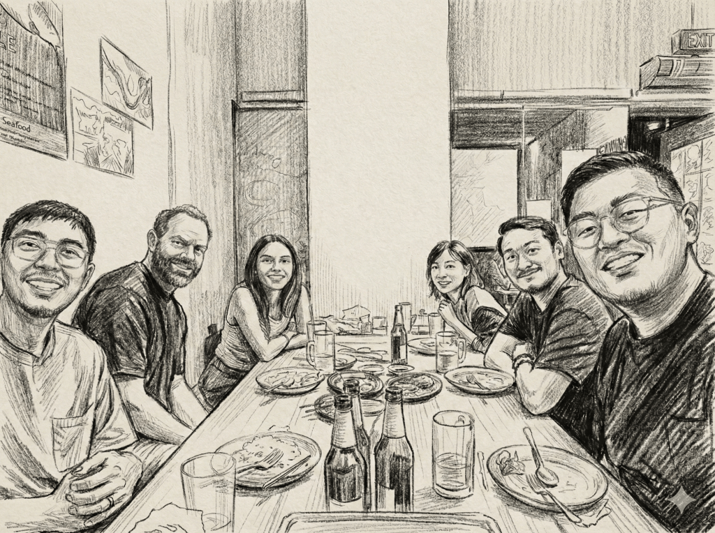A few of us met up for craft beers and Thai food on Sunday, with the reminiscing and catching up going past midnight. Here’s a privacy-preserving photo-turned-courtroom sketch made with Gemini’s help.