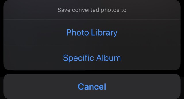 - After you’ve specified what needs converting, HEIFer will ask you where you want to save the new photos. Tap “Photo Library” to simply save them. Tap “Specific Album” if you want to organize them into an existing album. Note that if you tap “Cancel” at this stage, nothing will be saved or deleted.