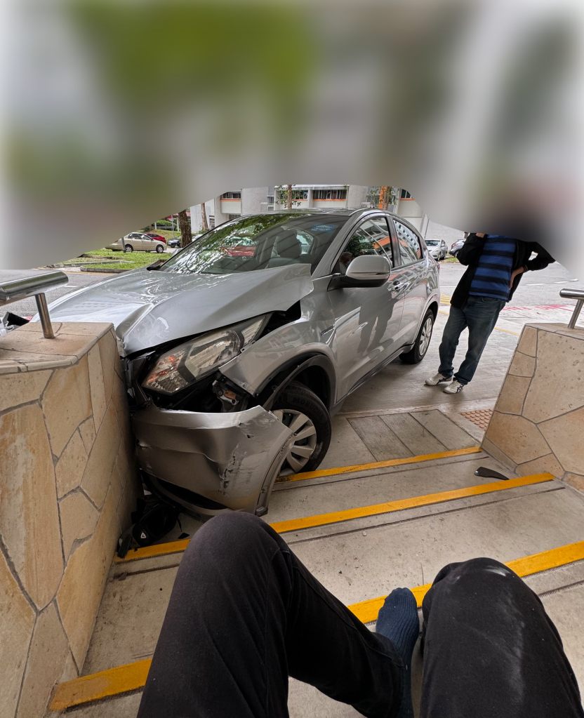 As I approached the pick-up point, I saw the car approaching and waved at him, walking continuously down the stairs to the road as I watched him do a three-point turnaround to come at me from the right direction. But suddenly, instead of slowing down for me to get in, the car suddenly lurched forward at full speed. At this point, I was maybe at the very last step down, and the car was coming directly towards me instead of parallel, like you would when picking a passenger up.