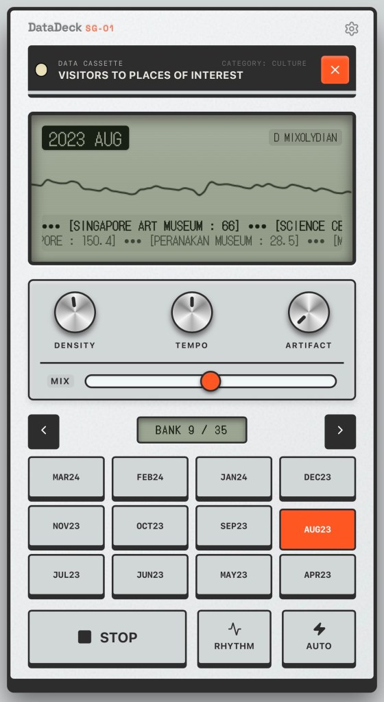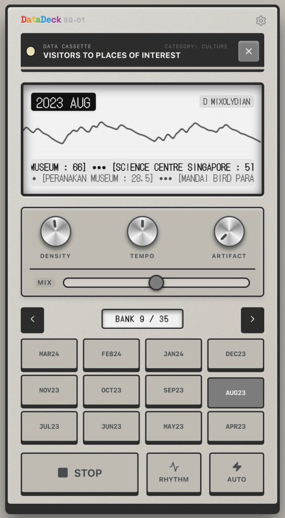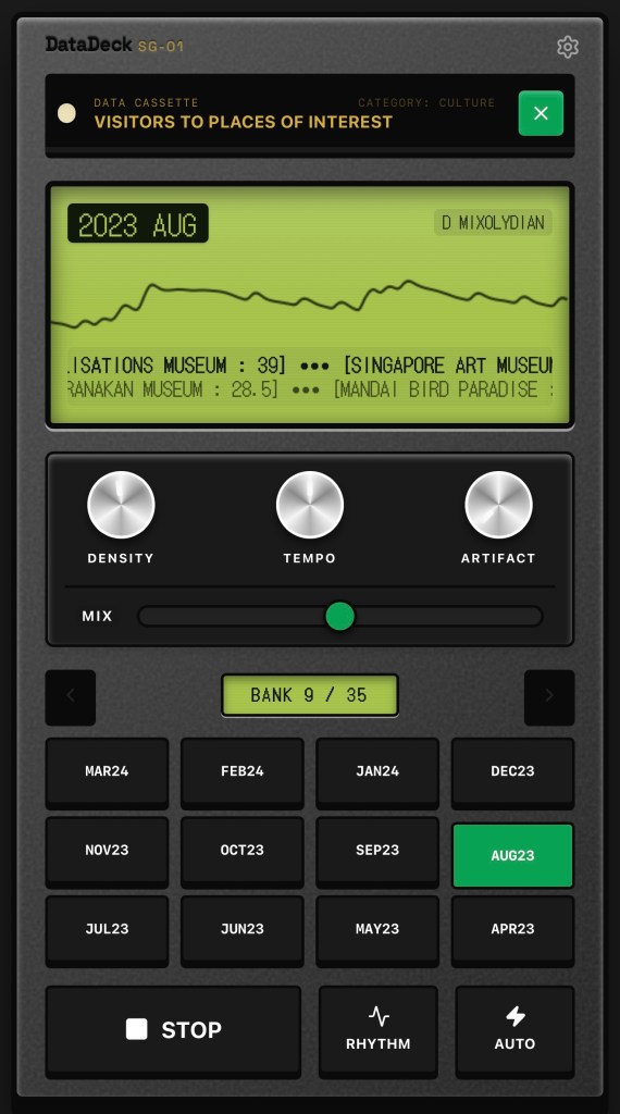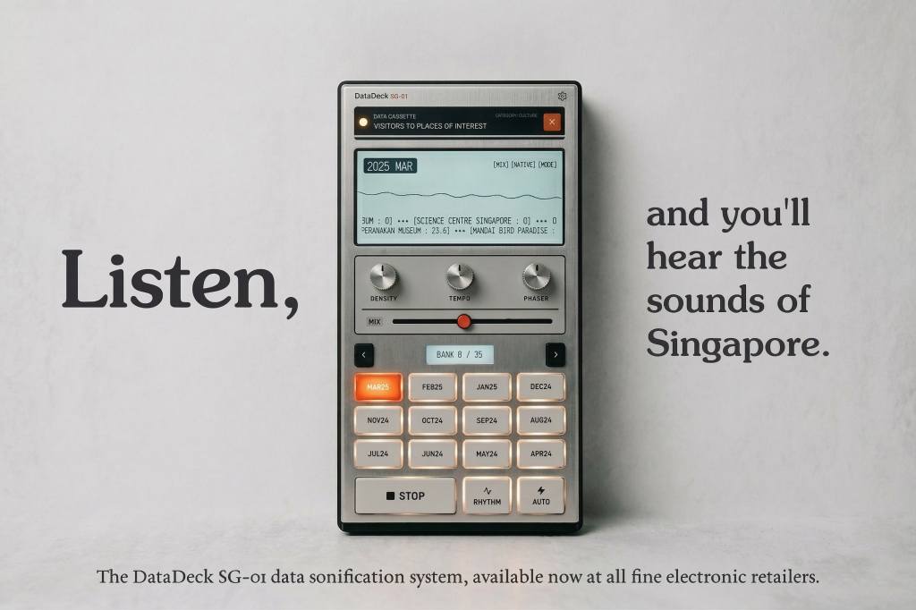 Singapore generates (and publishes) an extraordinary amount of data about itself — temperatures, taxi coordinates, dengue clusters, carpark availability, ticket sales at major attractions. Numbers that civil servants read in spreadsheets and the rest of us ignore entirely. The DataDeck asks, “but what does it sound like?”