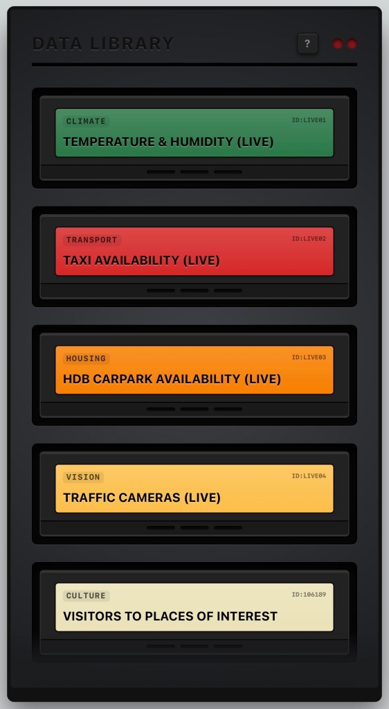 Each Data Cassette draws live government feeds from data.gov.sg and renders them as distinct genres. There are ten cassettes in all, each with their own acoustic logic and ways of interpreting the city.