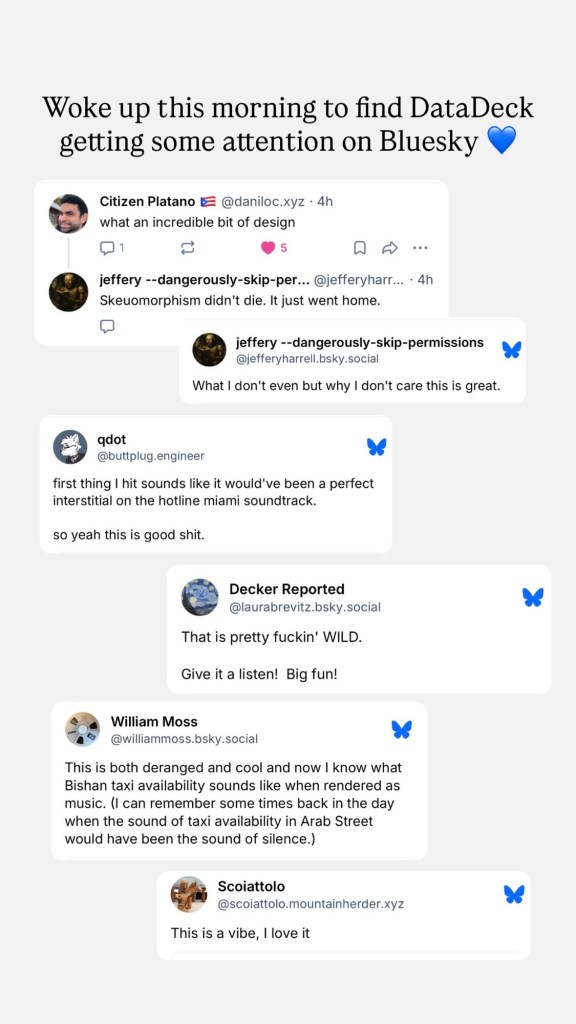 On Wednesday morning I woke up and saw that my last app DataDeck was getting a bunch of likes and reposts on Bluesky, which was a nice surprise. If ever there was a place where people would appreciate a wacky, nerdy idea, I guess that would be it.