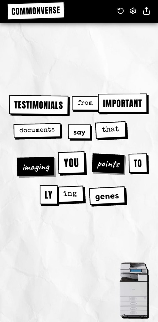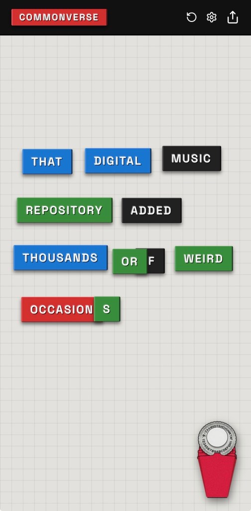 I made a couple of post-release updates to my magnetic poetry non-game, CommonVerse. There are now two new themes, one called Label Maker that resembles those little Dymo stickers we used to make, and another called Zine which is like a random note of cutout words. The UX has also been improved in subtle ways that might make it easier to manage making sentences.
