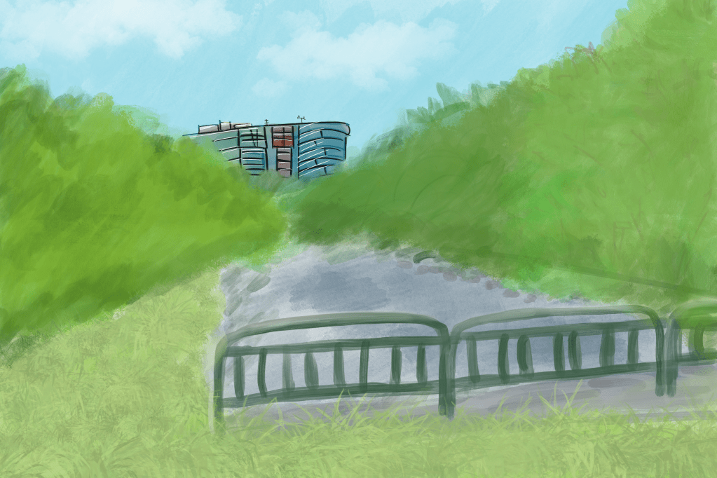 Caveats in Paint (Digital) #4: View of an office building (function assumed) seen on one of my walks (rarely undertaken), 2022.