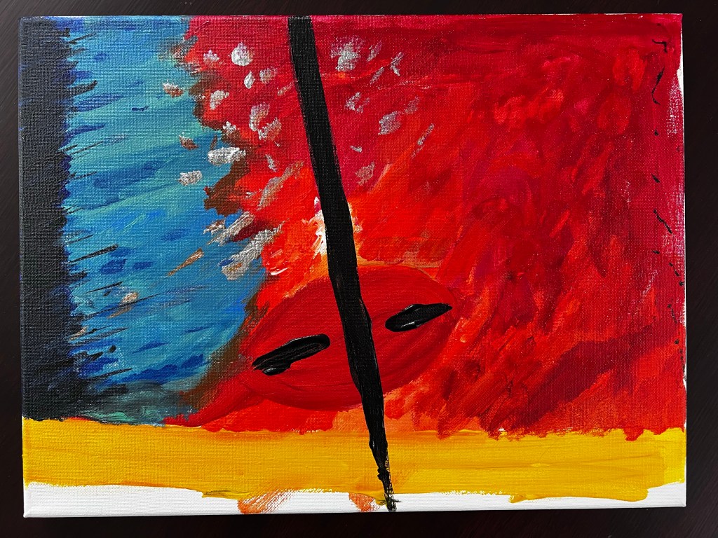 Yesterday we took our littlest niece out for her animal-themed Christmas present: a visit to an art studio that has cats running around for inspiration and/or distraction. She whipped up a colorful, abstracted cat with acrylics in about 15 minutes and then spent the next two hours playing with real ones. I slapped paint around and ended up with this below. It’s… jarring to move from digital to physical. Not only do you not have Undo and Fill tools, but you have to plan your layers differently. Ugh!
