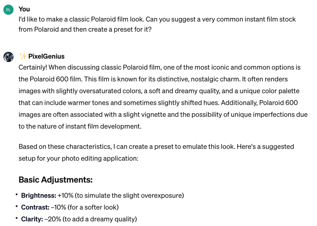 I prefer to learn by trying stuff out rather than watching videos or whatever, so when I first started using Lightroom, it was a messy process of trial and error that lasted years. ✨PixelGenius turns that into an interactive, guided experience. It’s like having a photo editing expert on demand, and you can even get into deep conversations about color theory and photographic history. All you need is a ChatGPT Plus account.