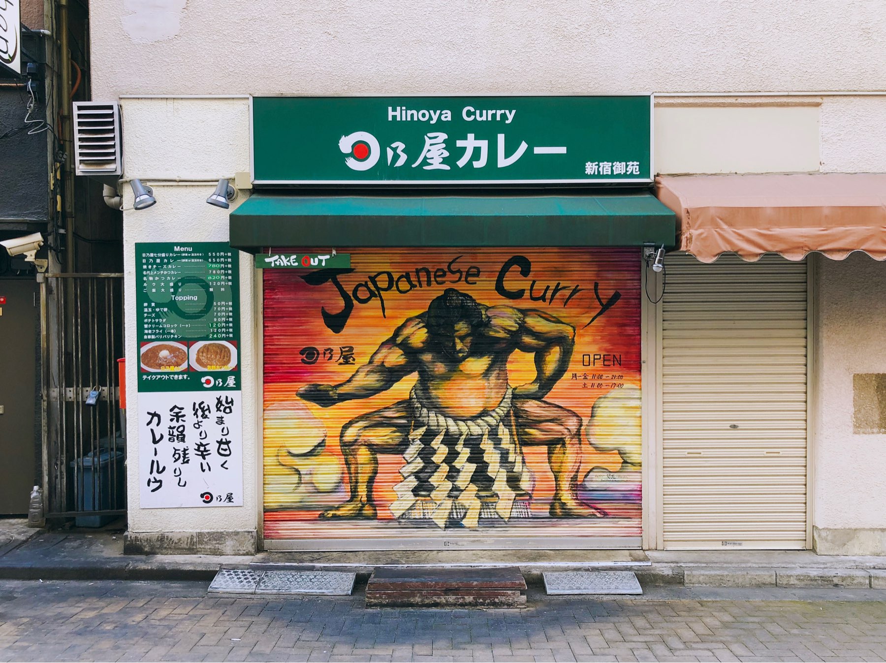 One more week to Tokyo, and I’m super excited to finally have Hinoya Curry. Here’s a photo of a sumo wrestler painted on the shutters of an outlet I passed the last time around. Chris “The Foreigner Who Loves Curry” Kohler added them to his list, so my expectations are HIGH.
