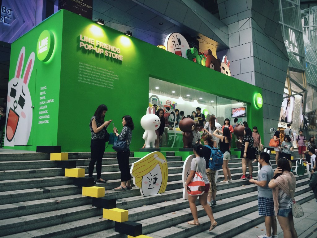 Japanese-Korean messaging app LINE has opened their first pop-up store in Singapore, on a prominent stretch of the core shopping boulevard of Orchard Road. It will run for a month and reap immeasurable marketing value from the high visibility and sure-to-grow lines of fans eager to buy their cleverly designed character merchandise.
