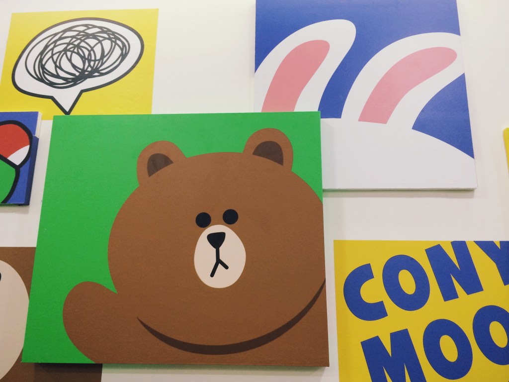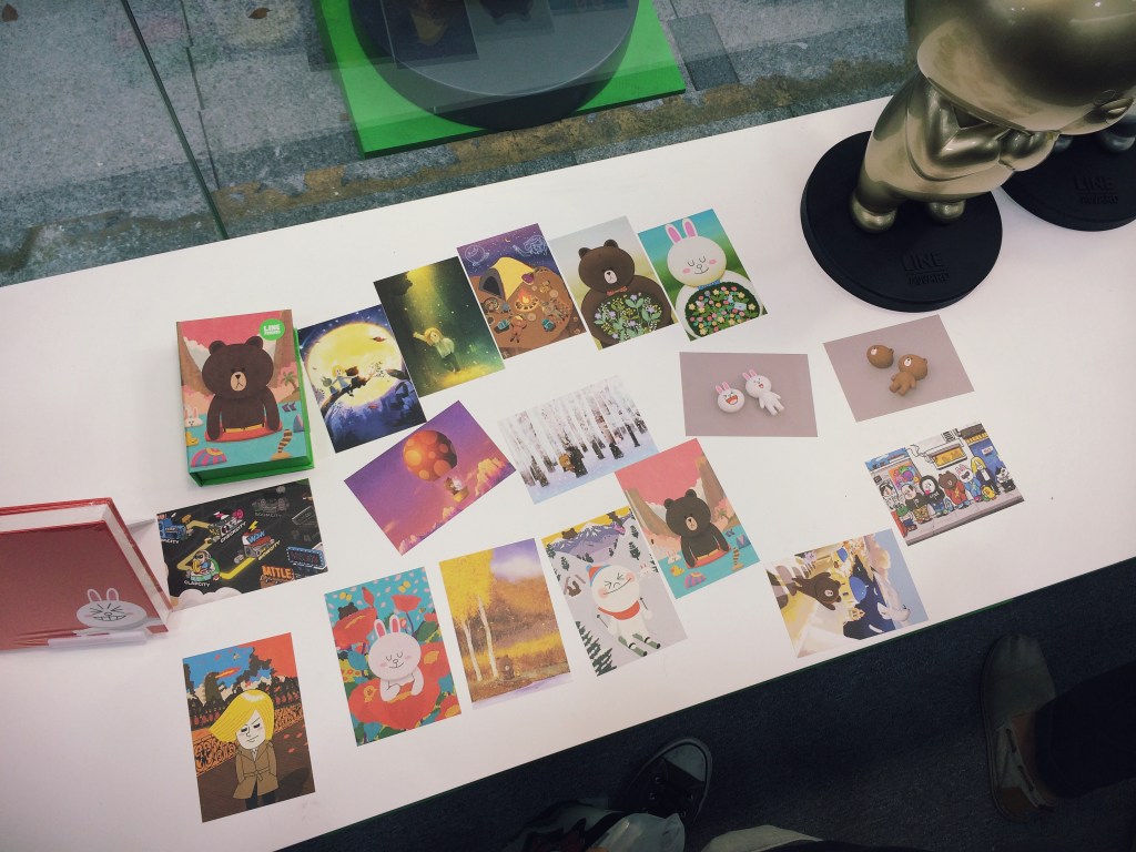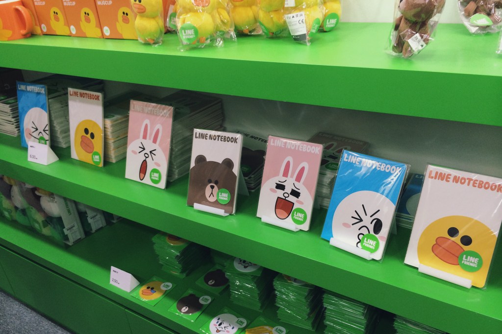 The crowd lining up tonight was about 2:1 female to male, which seems in line with LINE’s targeting strategy. There were a few people who definitely looked over 40, and everyone present was walking out with stuffed toys, diaries, notebooks, plastic folders, tote bags, mugs, badges and the like, all emblazoned with Brown, Cony, Moon, Leonard, Sally, James, and other characters I can name because I see and employ their images in chat conversations on a daily basis. LINE is lovable, obsessionable. Few others are by design.
